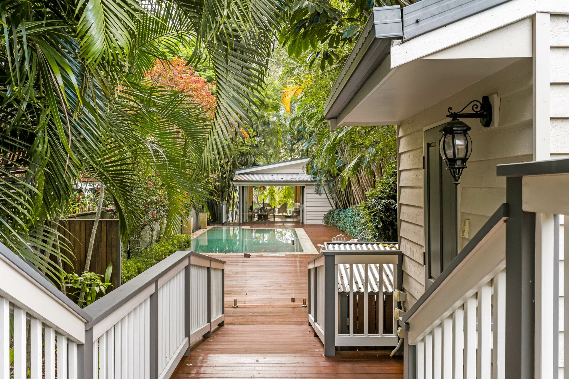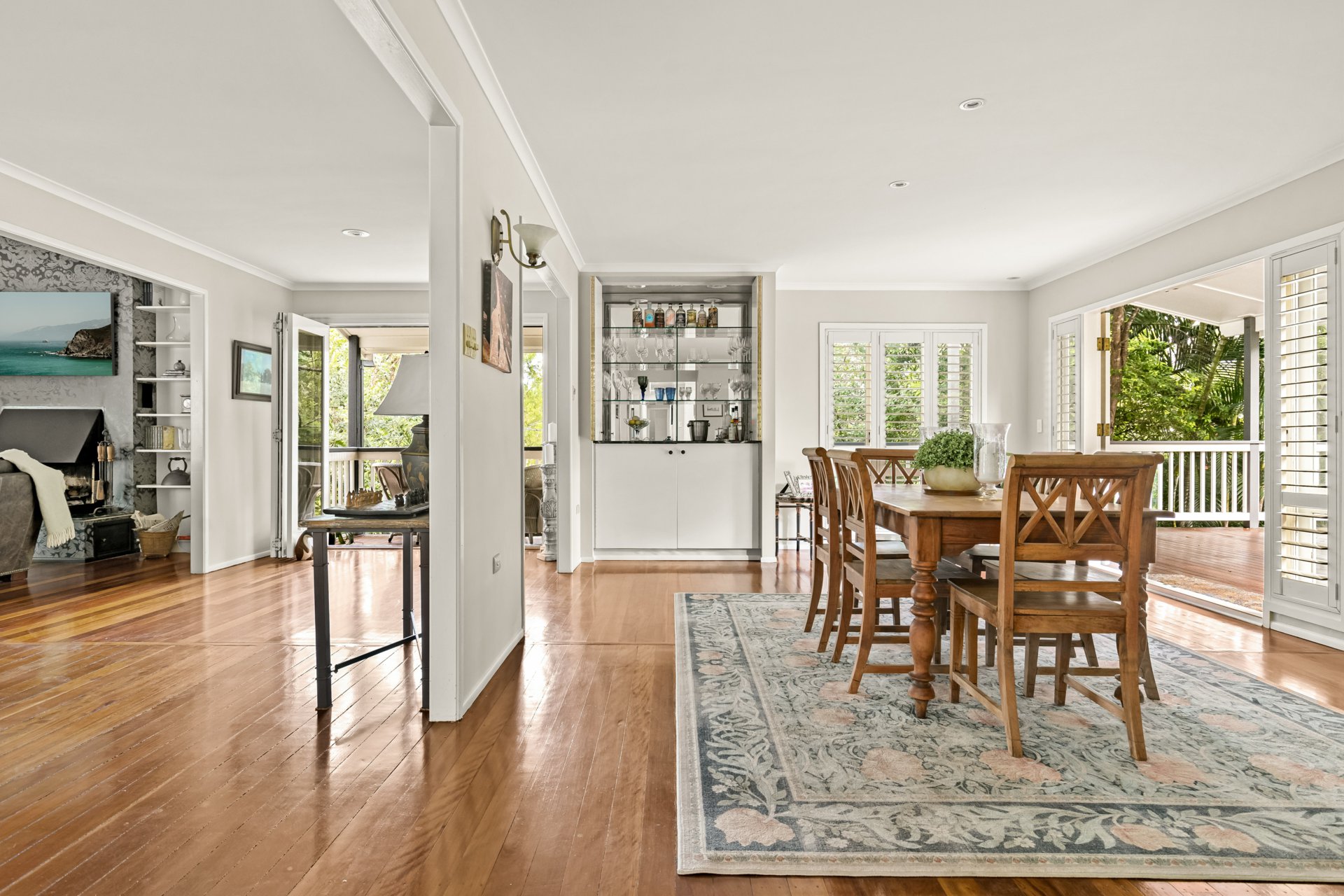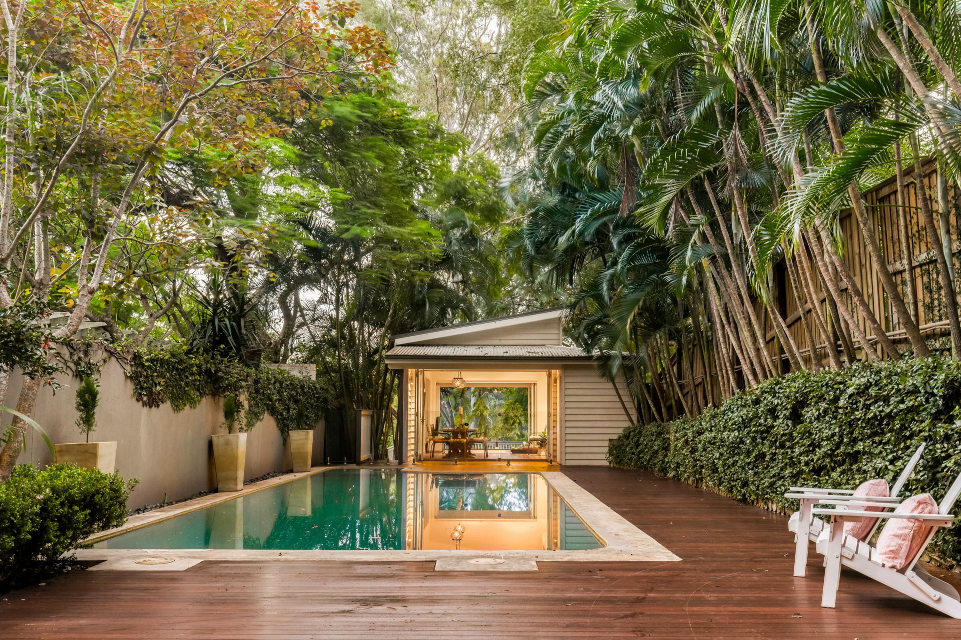 Flowing from the expansive living room is a formal dining area, a family room with a built-in cocktail bar, and a new deck added in 2015 that takes you across a decking bridge. This leads past a guest toilet and change room to a tranquil inground saltwater pool. At dusk, the path is beautifully lit with soft lighting and leads to the pool house, added in 2010.