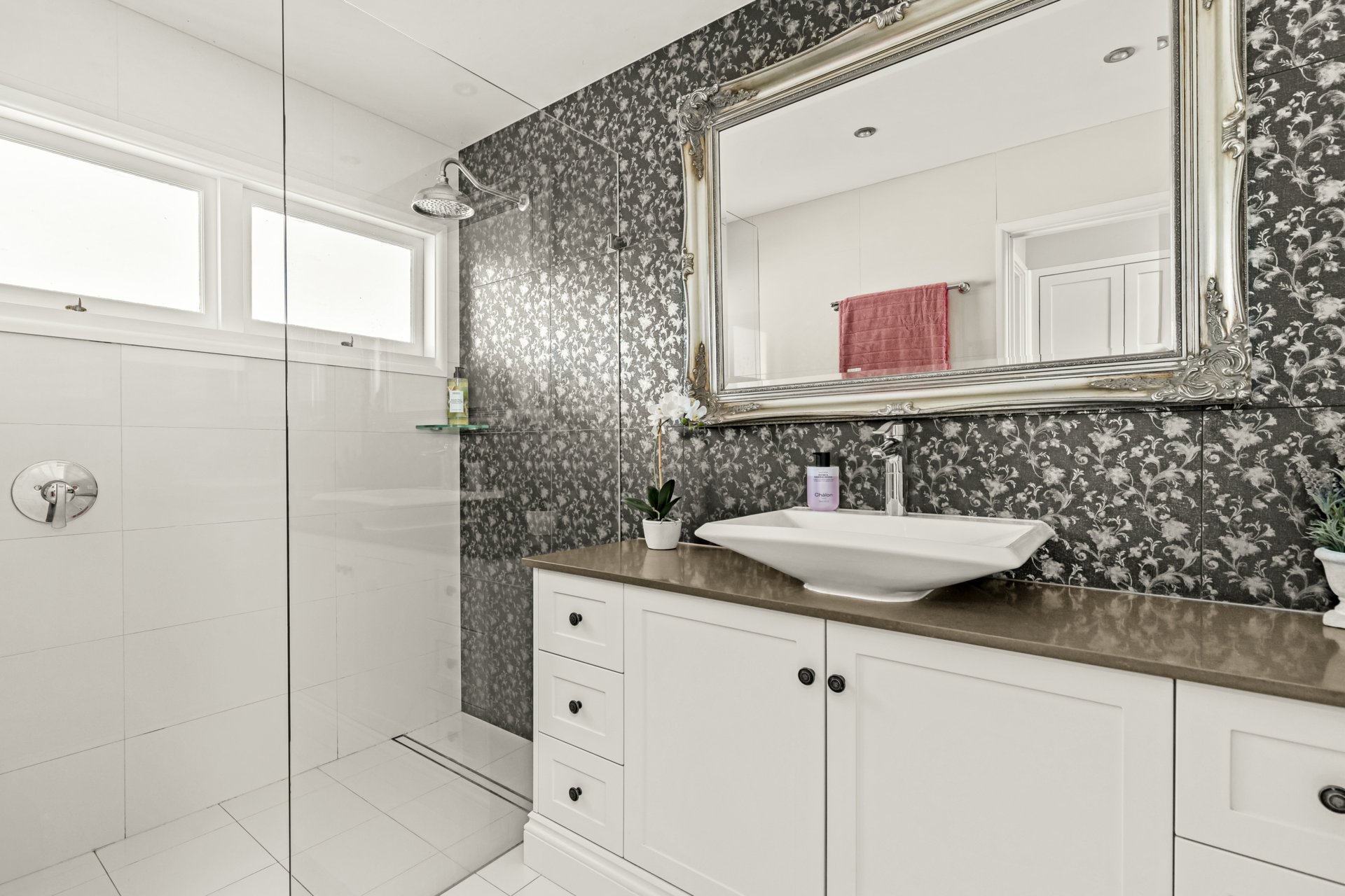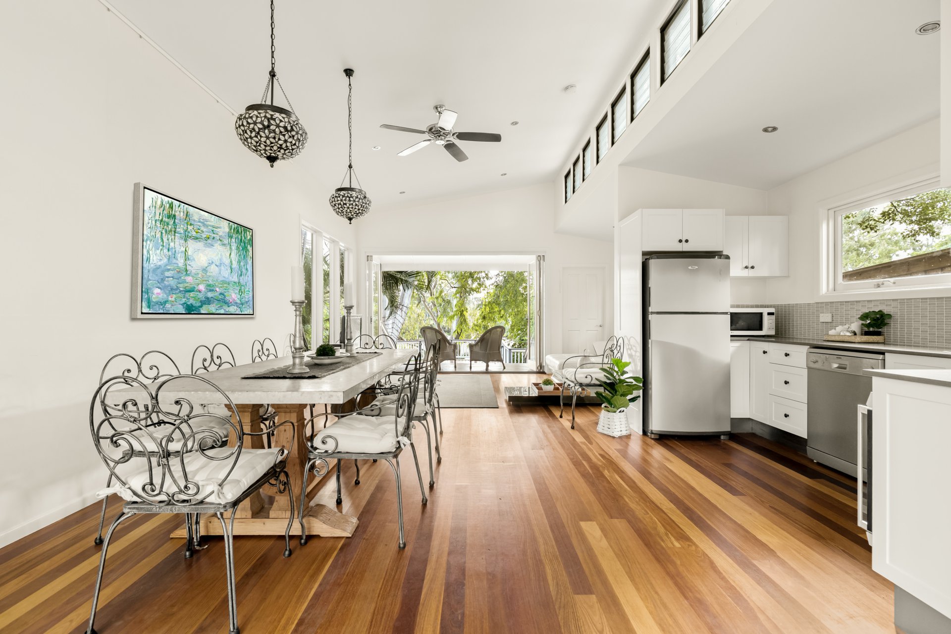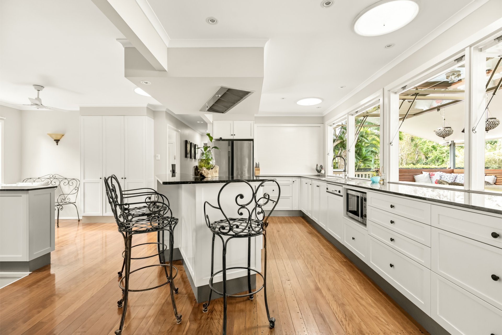 Flowing from the expansive living room is a formal dining area, a family room with a built-in cocktail bar, and a new deck added in 2015 that takes you across a decking bridge. This leads past a guest toilet and change room to a tranquil inground saltwater pool. At dusk, the path is beautifully lit with soft lighting and leads to the pool house, added in 2010.
