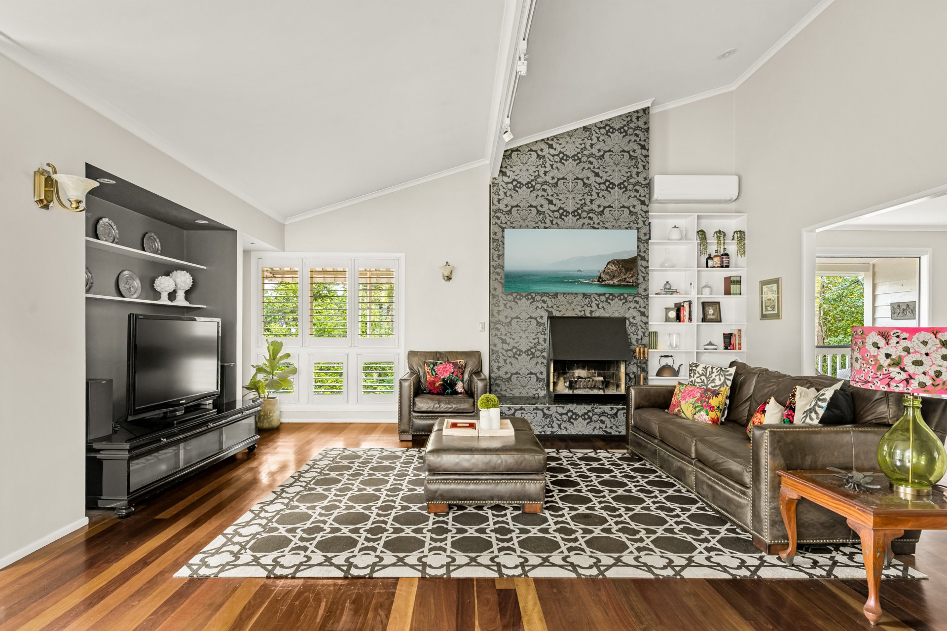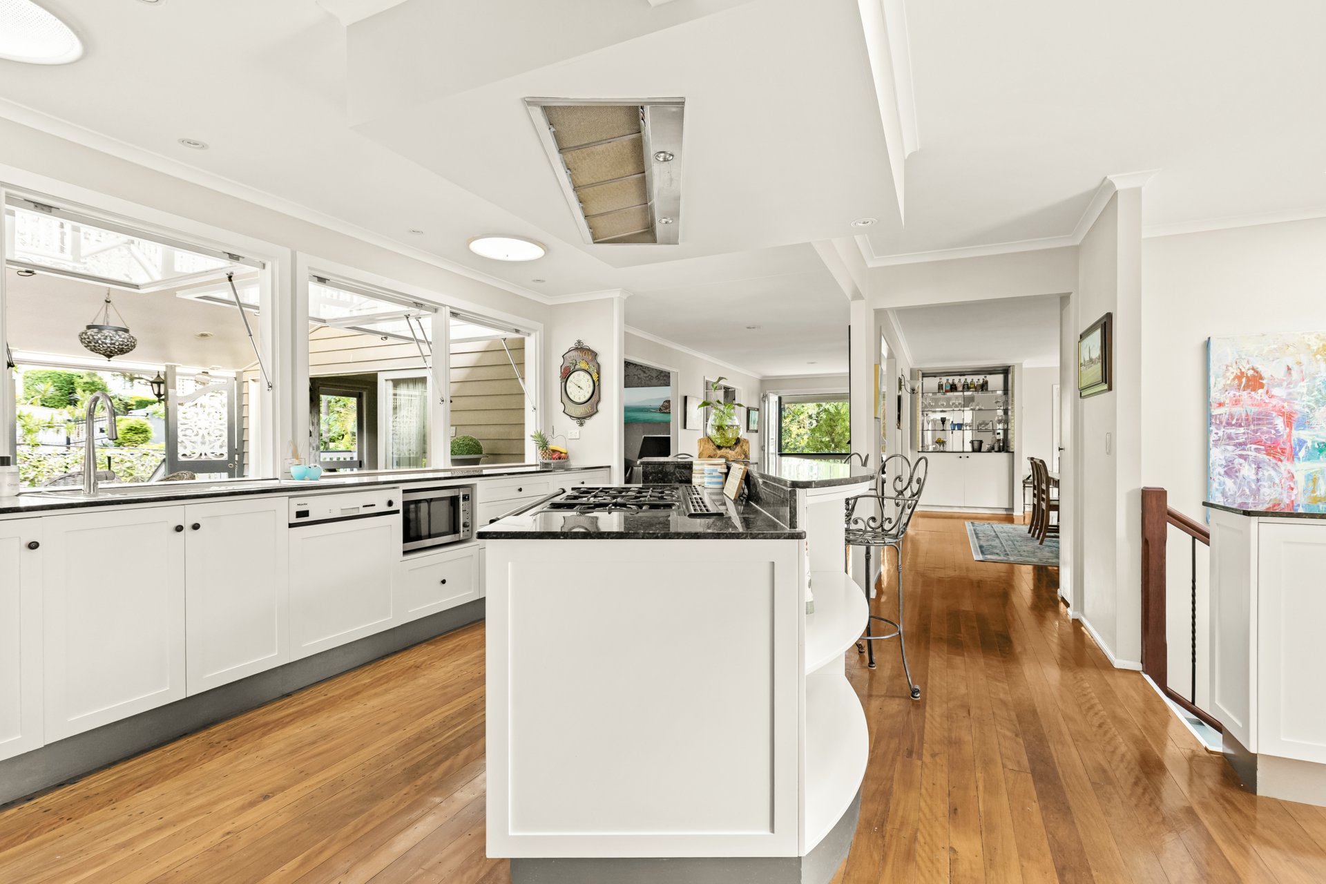 Taking pride of place in the centre is an elegant yet practical kitchen that caters for family members and guests to gather in the adjacent breakfast area while meals are prepared. An impressive Falcon brand range sits amongst abundant soft-close cabinetry and granite stone benchtops, asserting a commanding presence. A bank of hopper windows opens upwards to create a servery to the generous front deck—perfect for hosting parties or functions—which overlooks the full-size tennis court. The living room is another standout, with ample space for the family to gather. It showcases a 1970s-period open fireplace that reinforces its vintage appeal.