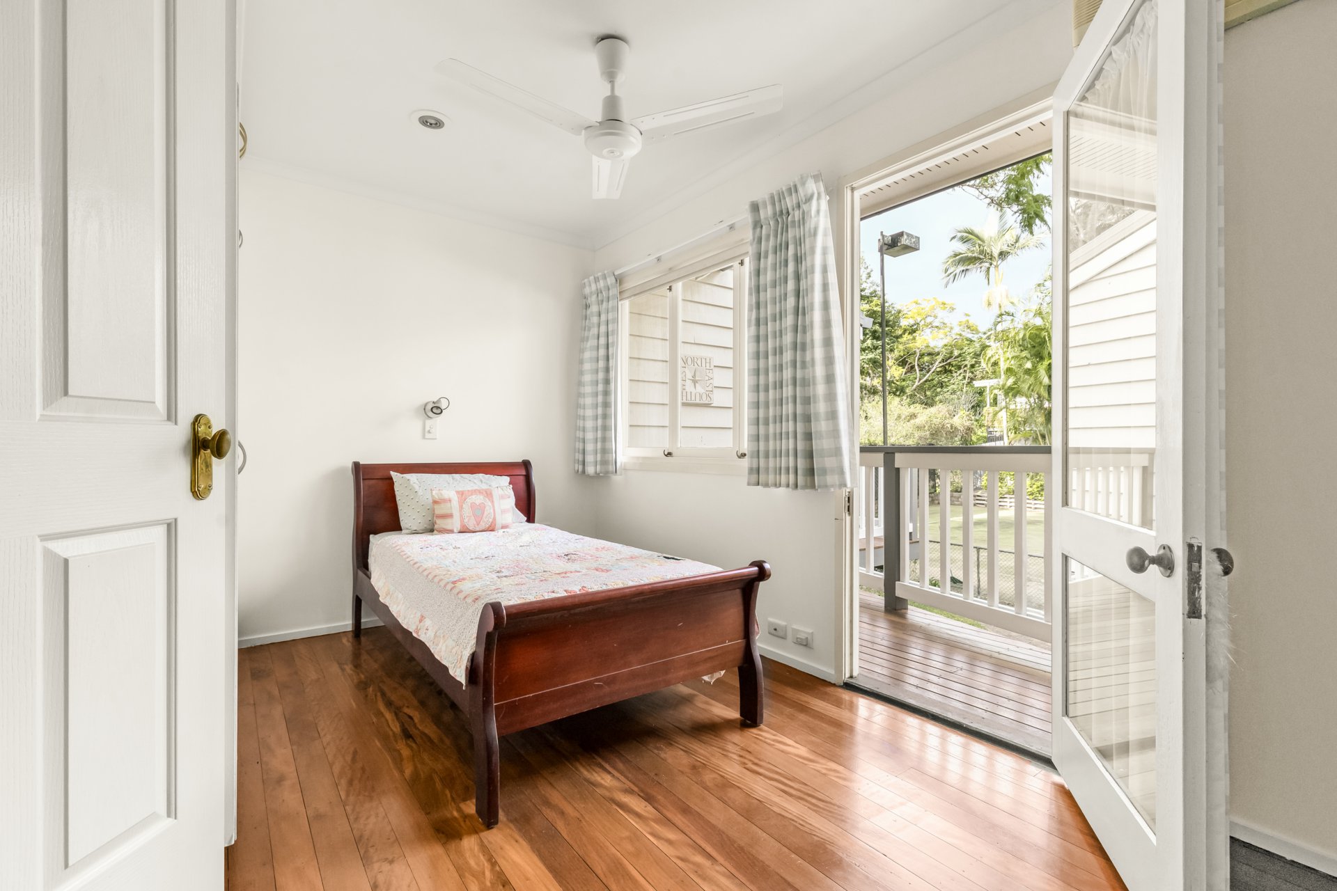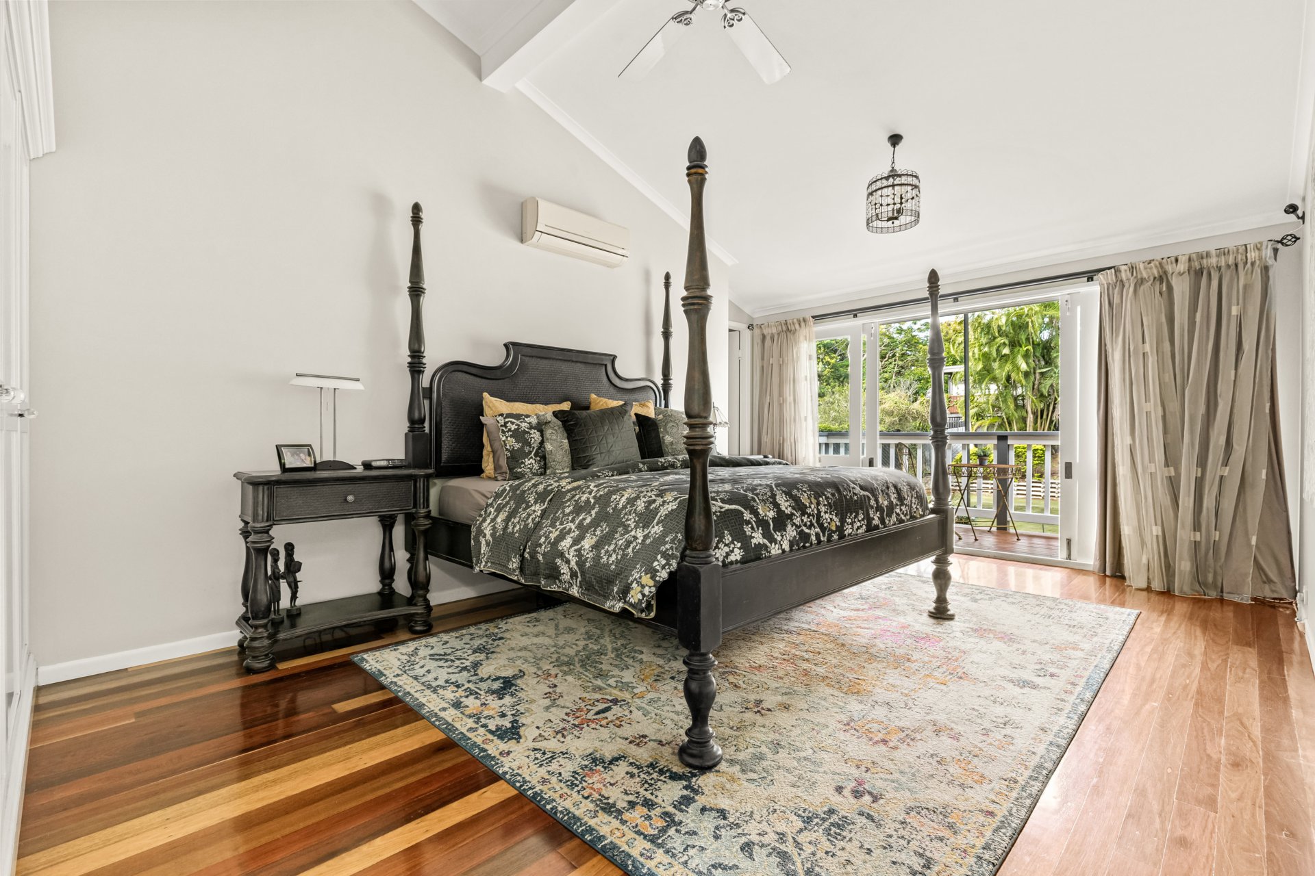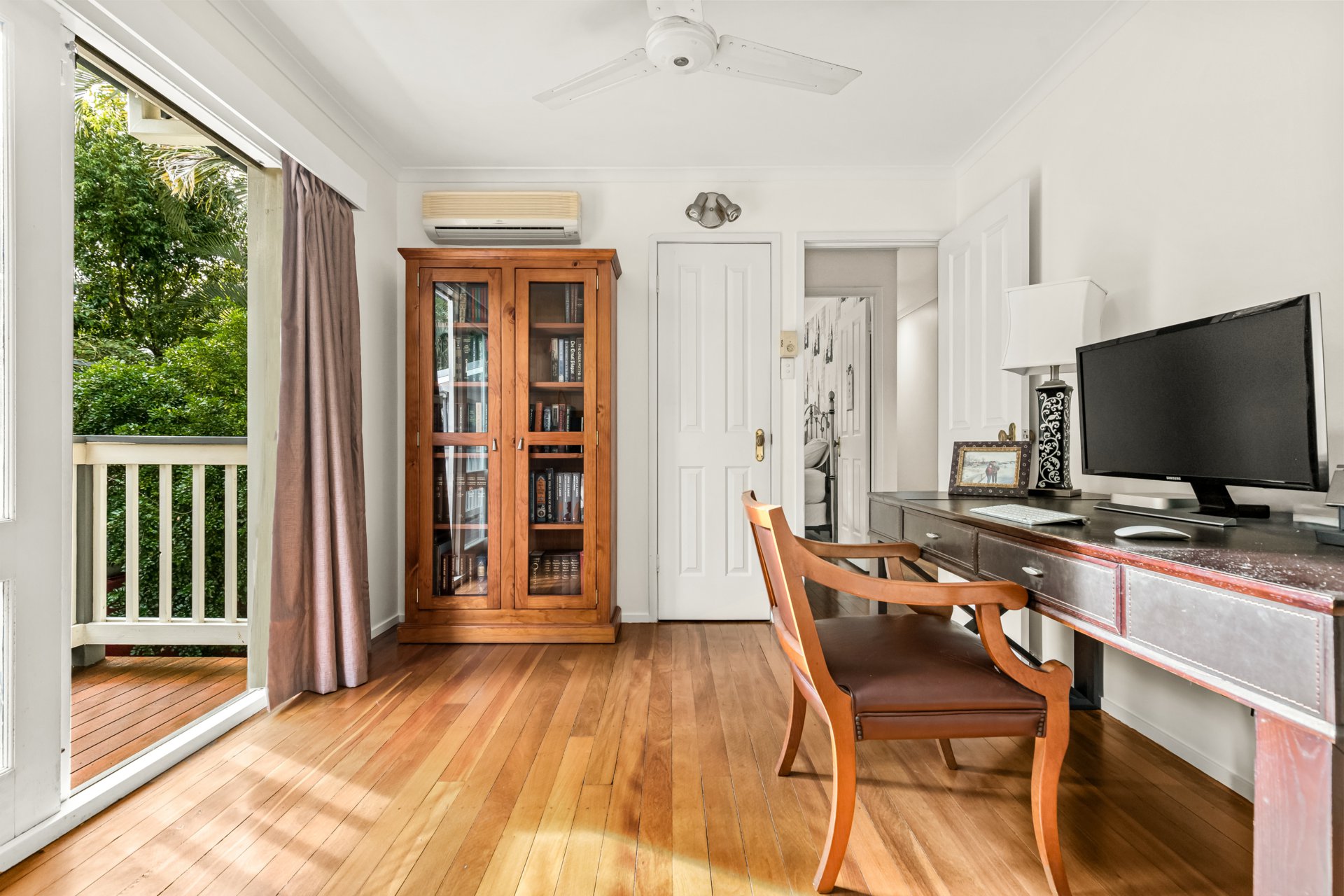 The simple floor plan is split over two levels, with the ground floor providing secure car accommodation for four vehicles, a workshop, gym, laundry, rumpus, utility or office, guest bedroom and extensive bathroom, while upstairs is clearly divided into open-plan living and entertaining areas and bedrooms. Connecting them is continuous polished hardwood flooring, featured throughout this level. Three of the four bedrooms are serviced by a family bathroom, while the main bedroom enjoys a charming ensuite complete with a separate bathtub. All bedrooms offer air-conditioning and ceiling fans; however, each room also provides access to its own balcony, allowing occupants to stay cool naturally during the warmer months.