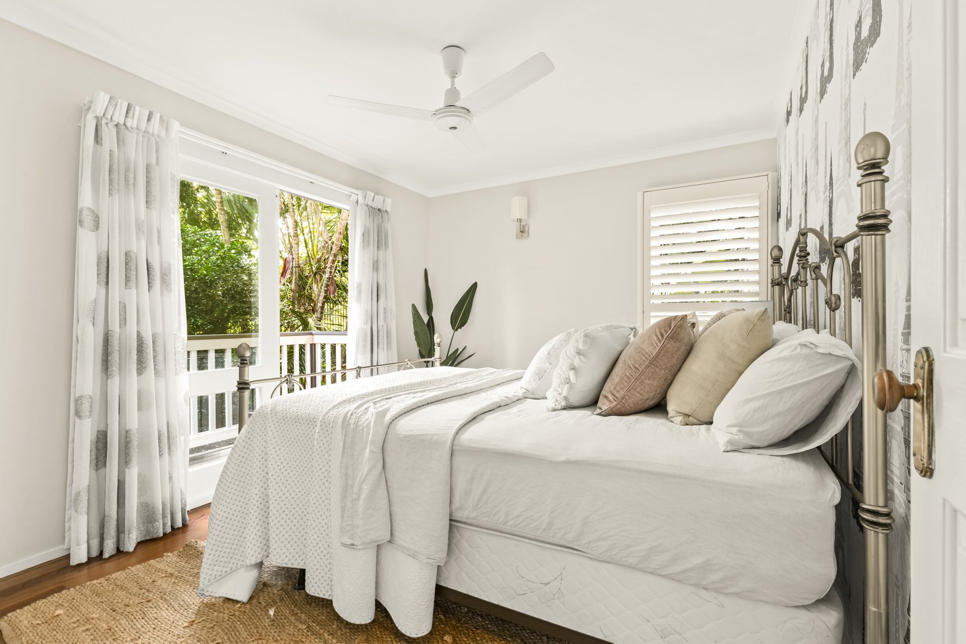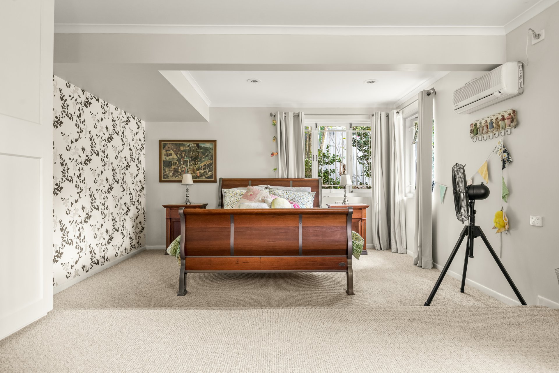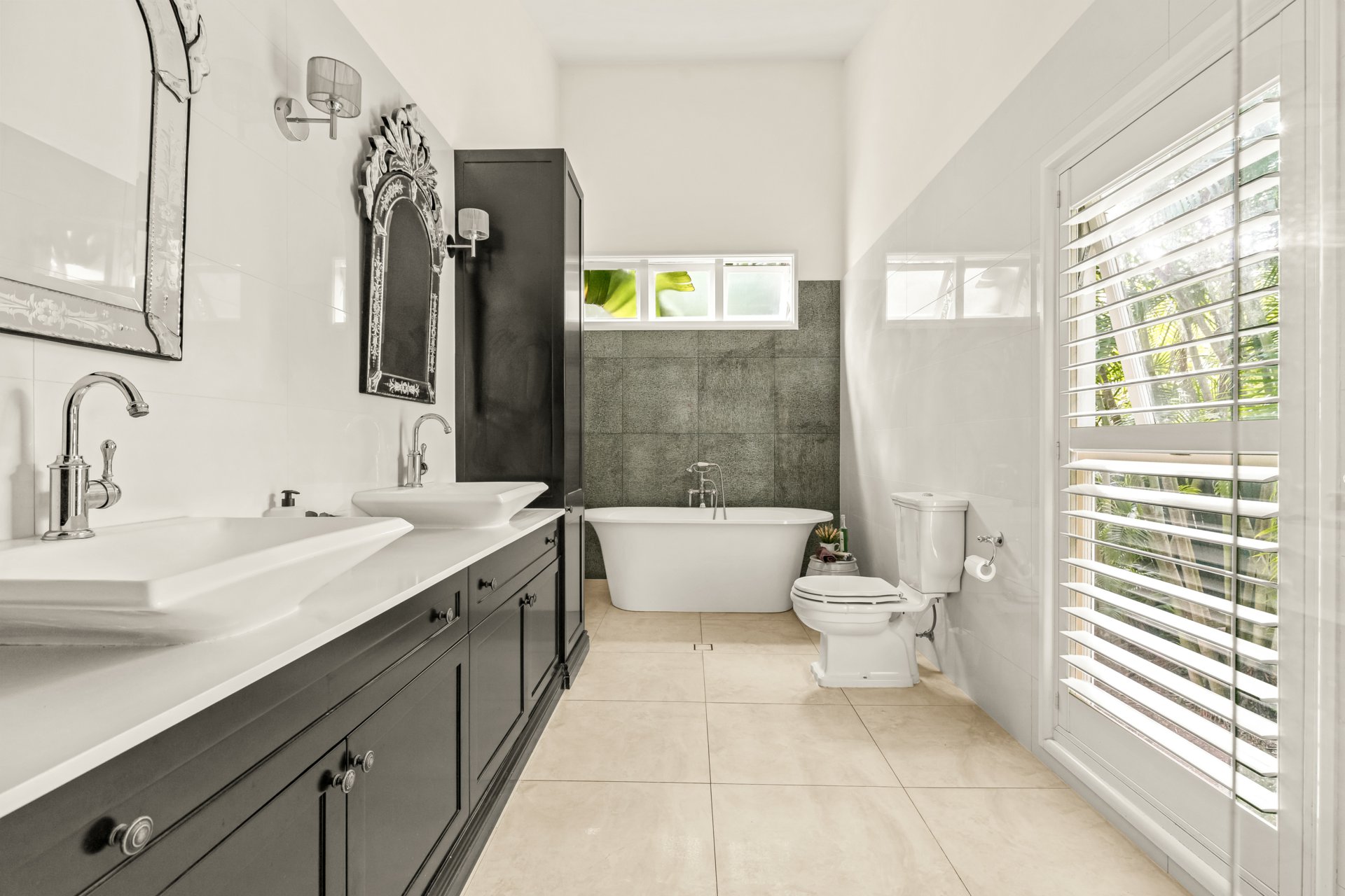 The simple floor plan is split over two levels, with the ground floor providing secure car accommodation for four vehicles, a workshop, gym, laundry, rumpus, utility or office, guest bedroom and extensive bathroom, while upstairs is clearly divided into open-plan living and entertaining areas and bedrooms. Connecting them is continuous polished hardwood flooring, featured throughout this level. Three of the four bedrooms are serviced by a family bathroom, while the main bedroom enjoys a charming ensuite complete with a separate bathtub. All bedrooms offer air-conditioning and ceiling fans; however, each room also provides access to its own balcony, allowing occupants to stay cool naturally during the warmer months.