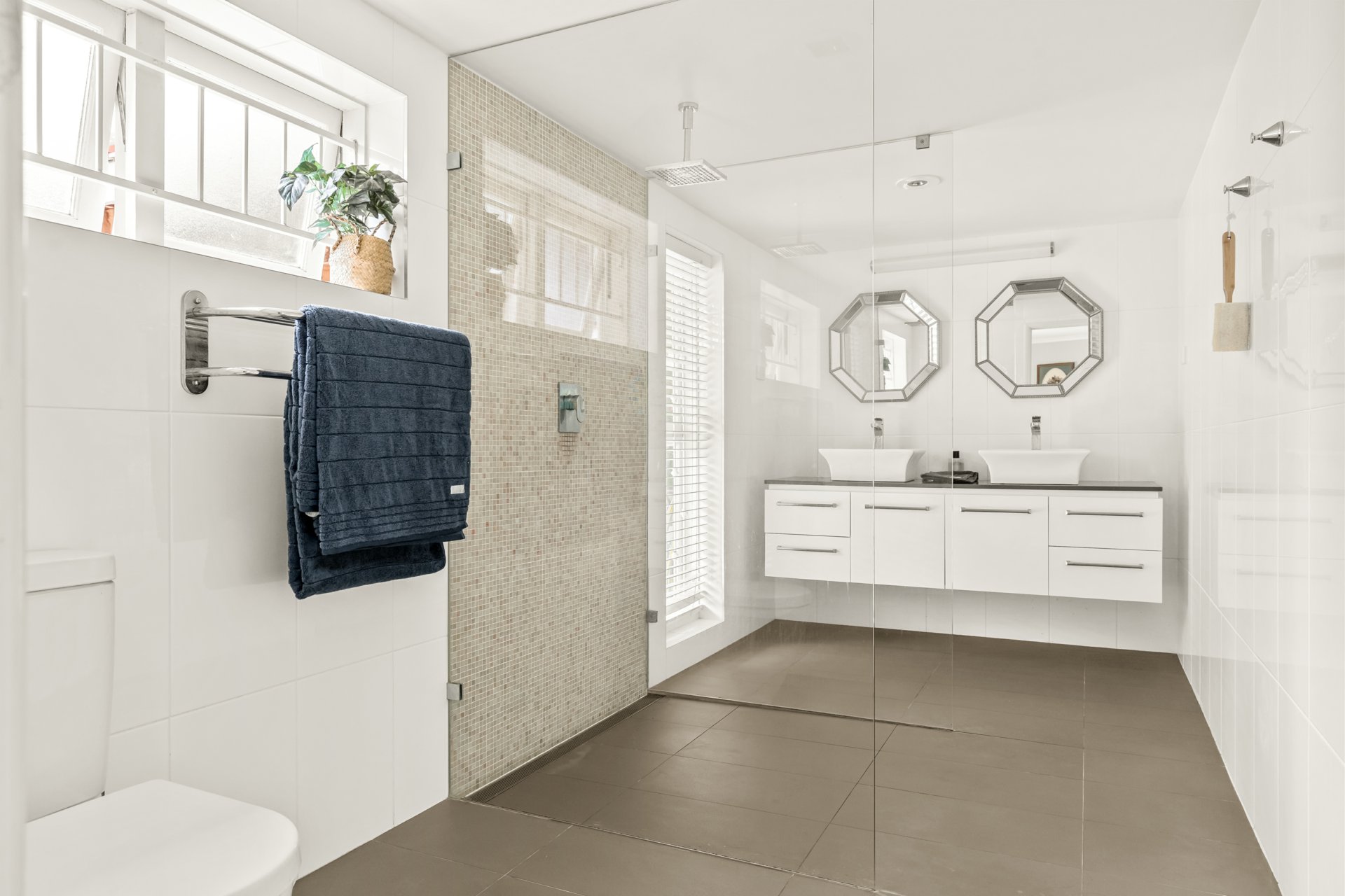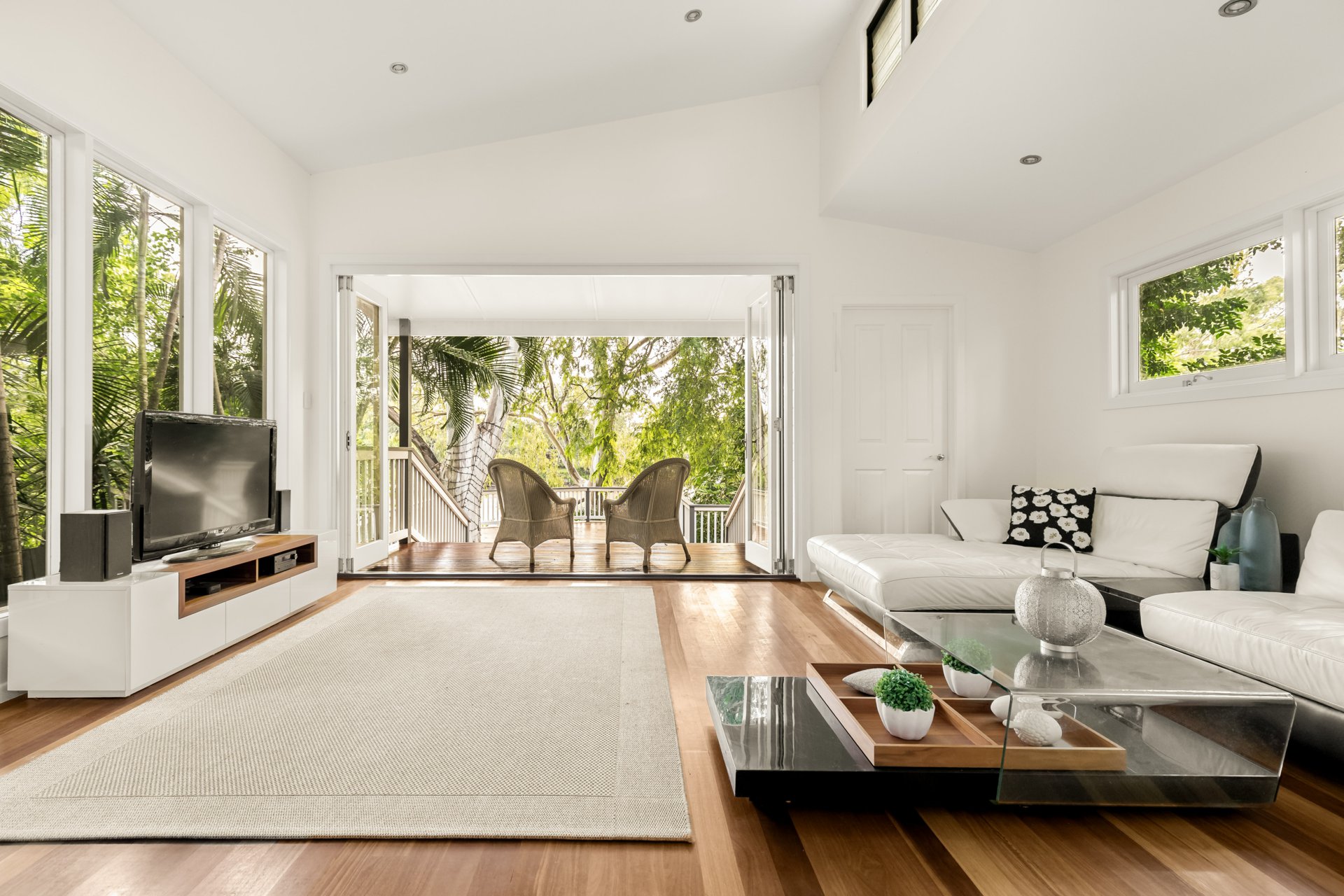 The vision for the pool house, designed by a renowned local architect, was to create a beautiful space for dinner parties, entertainment, or simply relaxing. Its secondary purpose was to service both the pool area and the extensive western-facing deck, which showcases elevated, picturesque views of the Brisbane River. Additionally, a stairwell leads down to lower decking near the river’s edge, where a pontoon could be explored in the future.