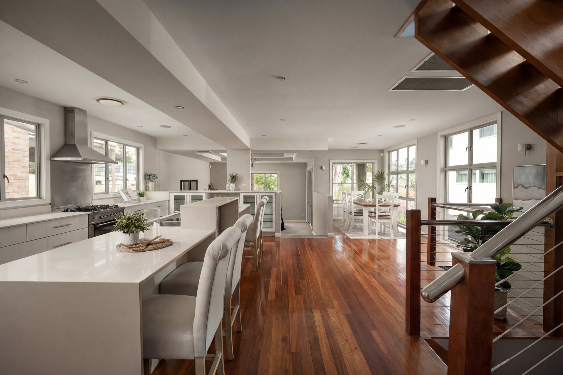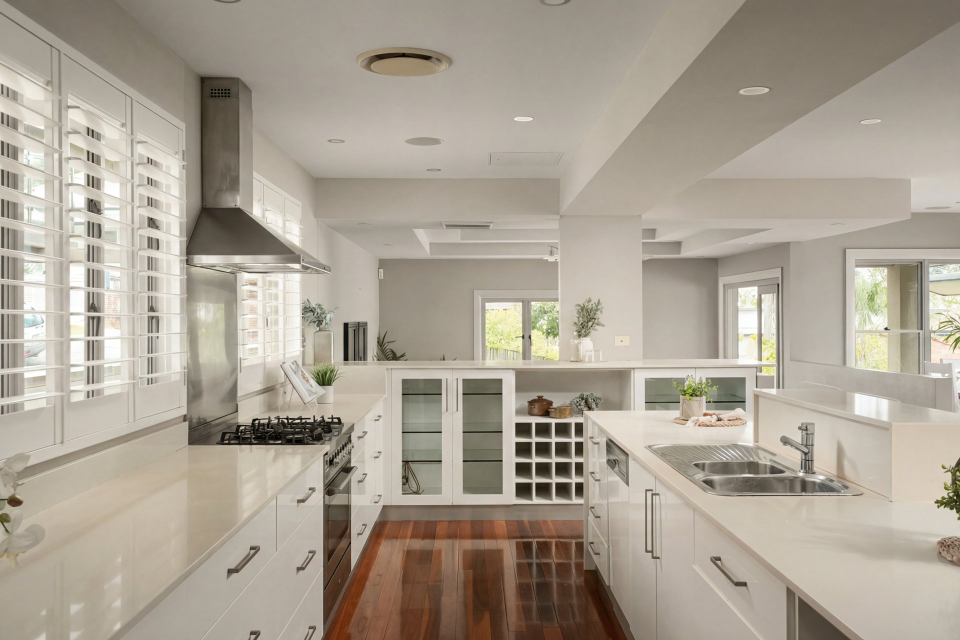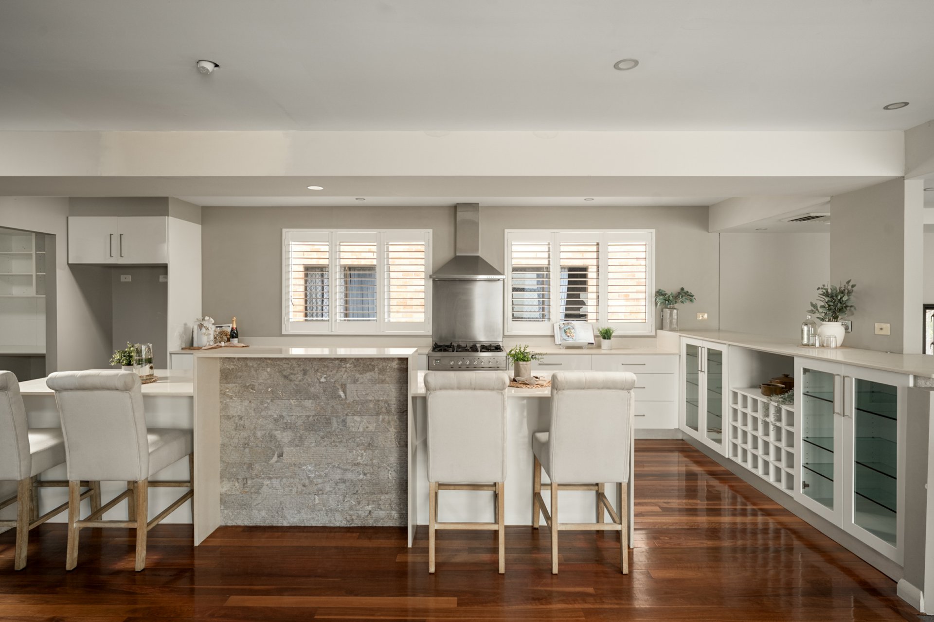 The middle level forms the heart of the home, showcasing expansive open-plan living areas accented by polished timber floors. A relaxed sunken lounge flows to an adjoining balcony, while the stunning central kitchen commands attention with sleek stone benchtops, an island with dual breakfast bars, integrated dishwasher, Ilve oven, five-burner gas cooktop and walk-in pantry. A formal dining area sits conveniently alongside.