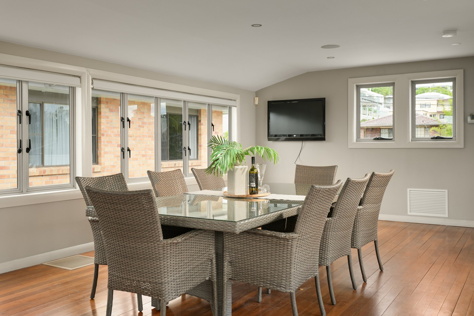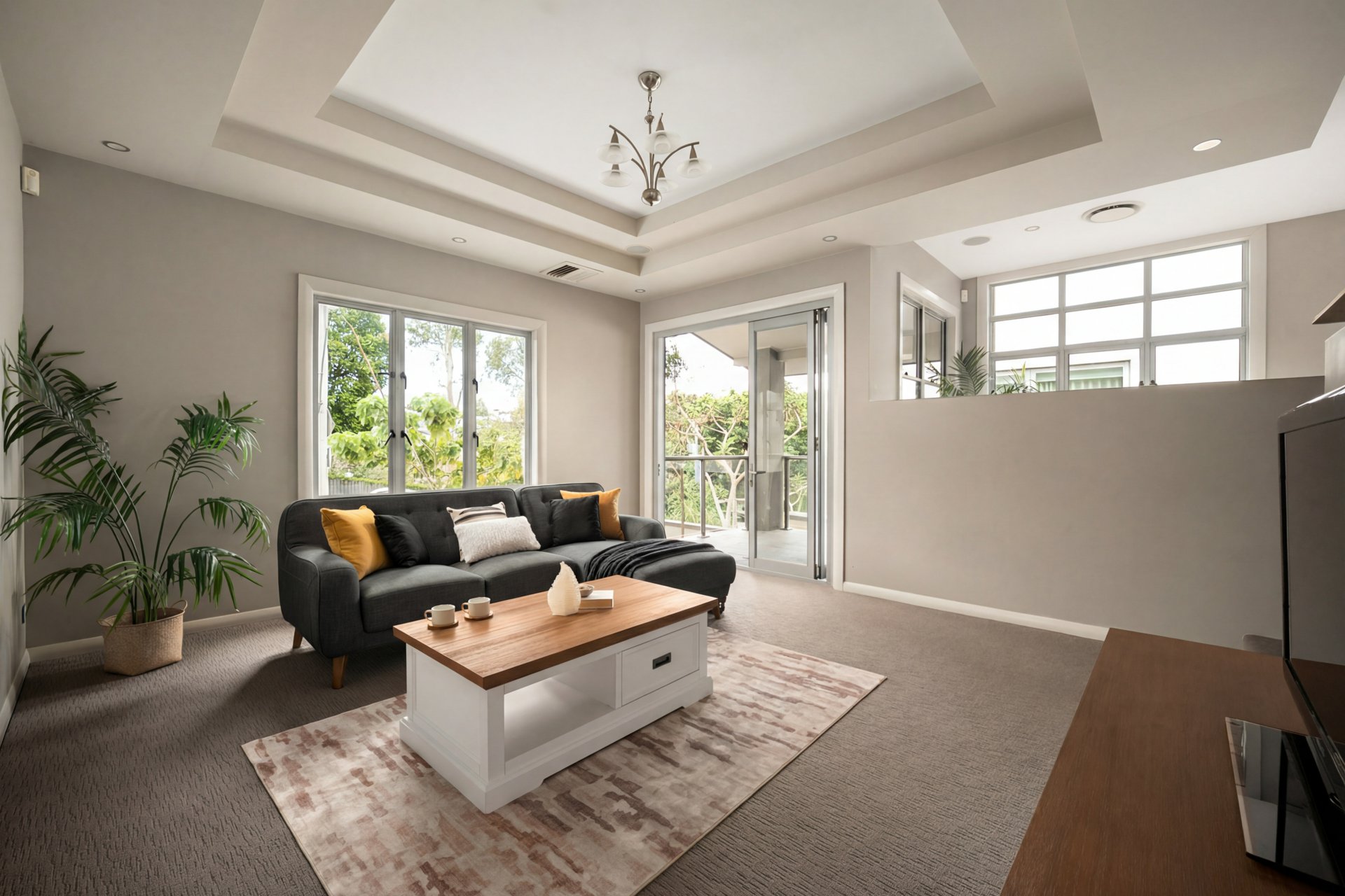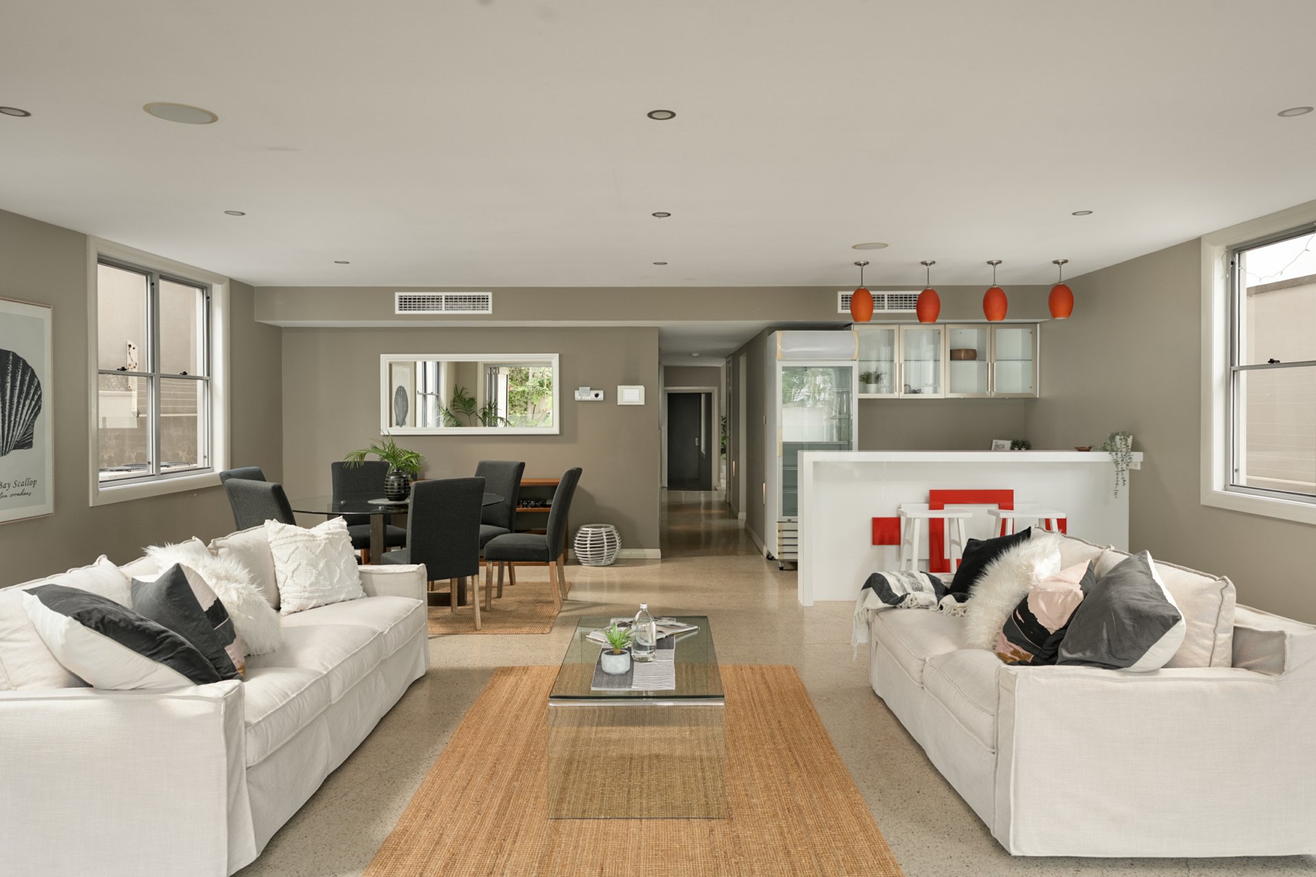 The middle level forms the heart of the home, showcasing expansive open-plan living areas accented by polished timber floors. A relaxed sunken lounge flows to an adjoining balcony, while the stunning central kitchen commands attention with sleek stone benchtops, an island with dual breakfast bars, integrated dishwasher, Ilve oven, five-burner gas cooktop and walk-in pantry. A formal dining area sits conveniently alongside.
