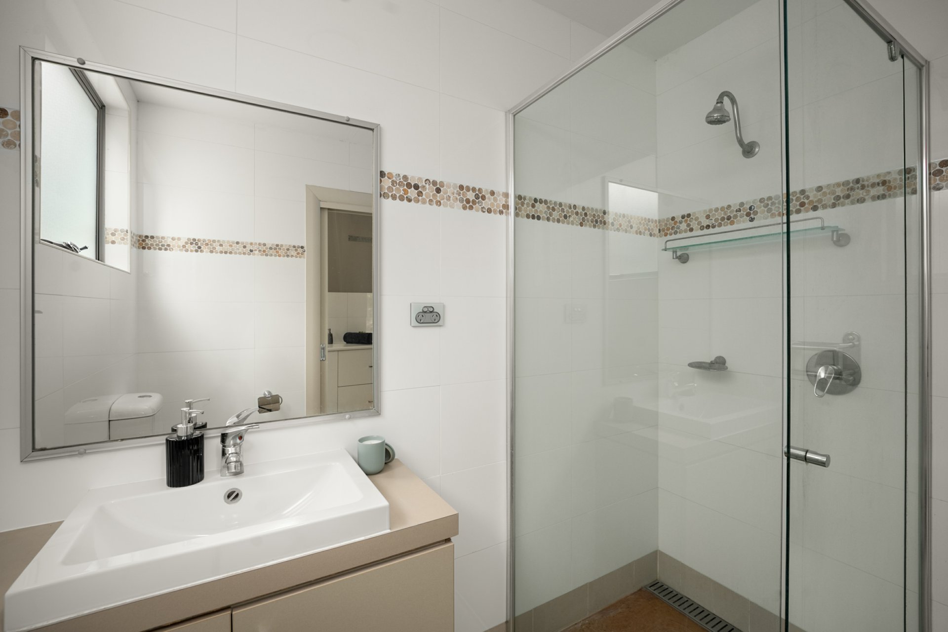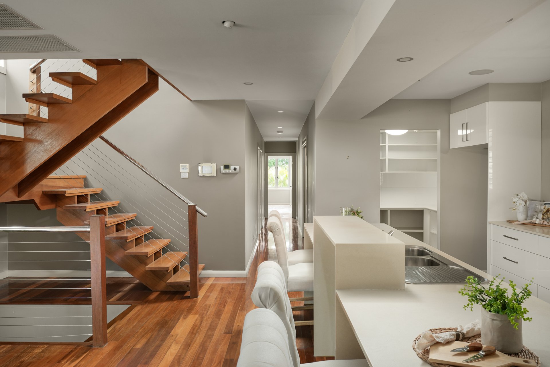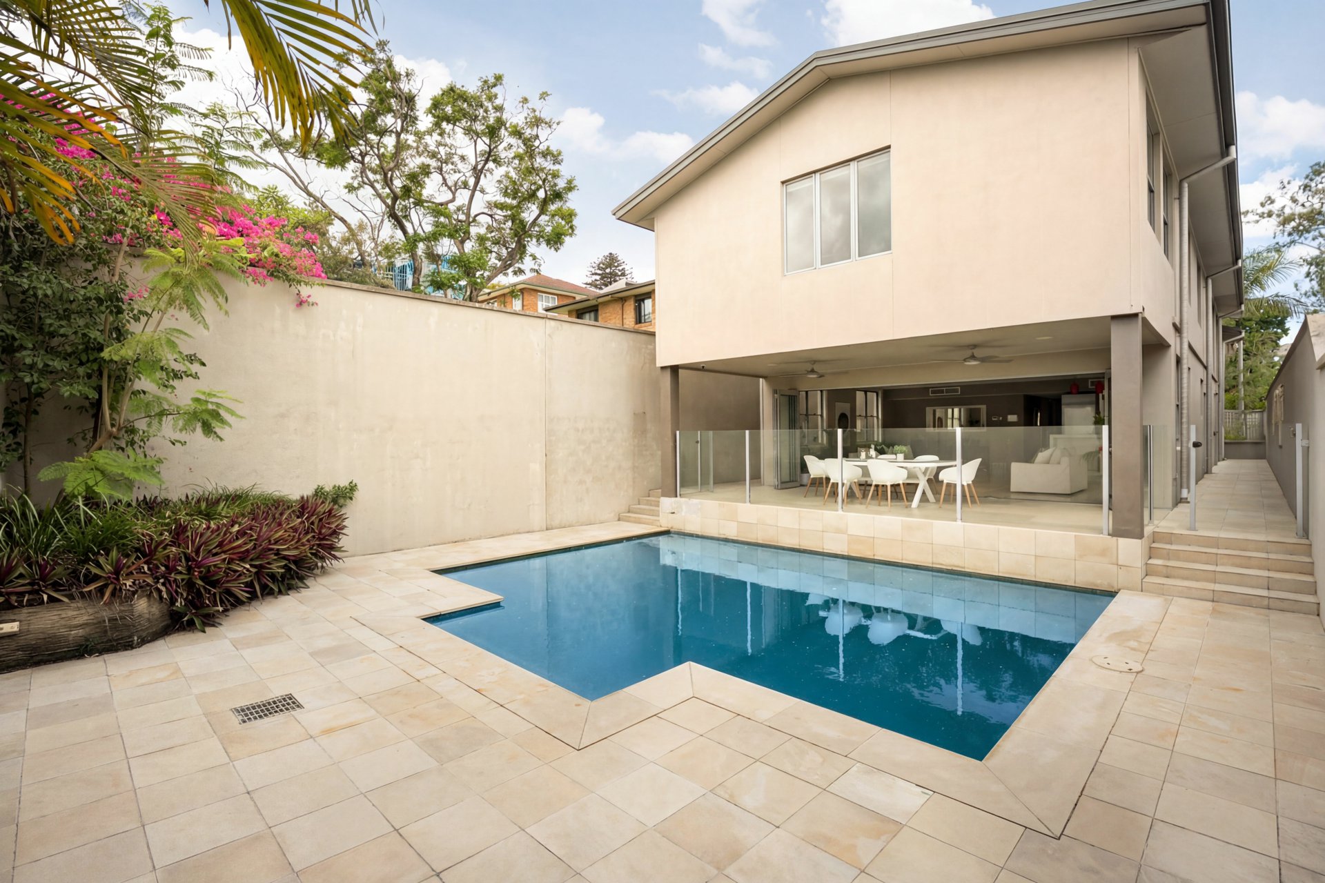 This level also accommodates three bedrooms, including the luxurious master suite with tranquil pool views, walk-in robe and modern ensuite featuring dual vanities and a double shower. The additional bedrooms offer floor-to-ceiling built-in robes and are serviced by the main bathroom.